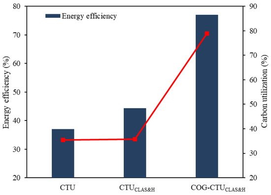 Energy and carbon utilization efficiencies of CTU, CTUCLAS&H, and COG-CTUCLAS&H.