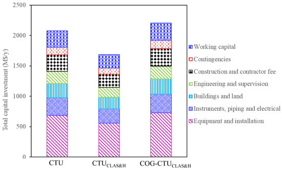 The following supporting information can be downloaded at: https://www.mdpi.com/article/10.3390/pr11030960/s1, Table S1: Ratio factors for capital investment; Table S2: Assumptions for the estimation of the total product cost; Table S3: Simulation results of the CTU process; Table S4: Simulation results of the CTUCLAS&H process; Table S5: Simulation results of the COG-CTUCLAS&H process.