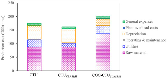 We investigate the total product costs (TPC) of the CTU, CTUCLAS&H, and COG-CTUCLAS&H to compare the economic performance of all three processes. The product costs are calculated by referring to our previous works as shown in Equation (27) [31,44]. In order to calculate the product costs, the following assumptions are made: the prices of coal, COG, stream, electricity and urea are USD 100/t, USD 0.06/m3, USD 6.0/GJ, USD 0.1/kW·h, and USD 357.14/t, respectively. The assumptions for 15 years of depreciation and a residual value of 4% were used for calculating the depreciation cost [42]. The exchange rate between the US dollar and the Chinese yuan is set at 7.0 yuan per US dollar.