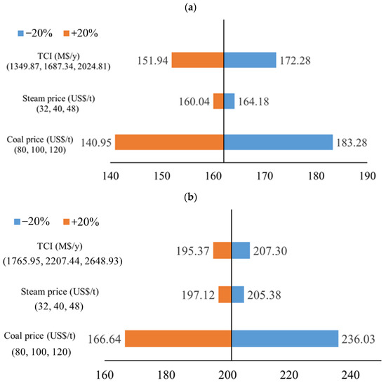 Sensitivity analysis of the effects of variables on the production cost of (a) CTUCLAS&H and (b) COG-CTUCLAS&H.