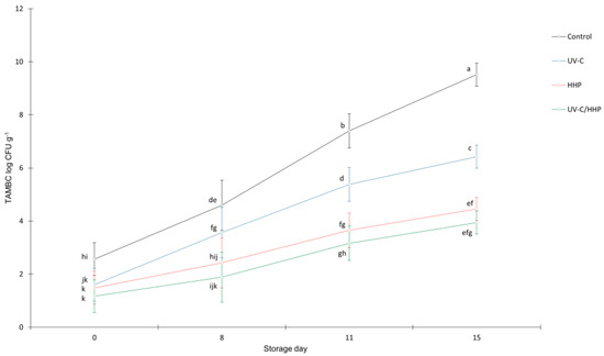All applied treatments significantly reduced TAMBC (p < 0.01) (Figure 1). The initial TAMBC of the control samples at the beginning of the storage (day 0) was 2.6 log CFU g−1. The observed reductions on the same day were 1.0, 1.1, and 1.4 log CFU g−1 for UV-C, HHP, and UV-C/HHP, respectively.