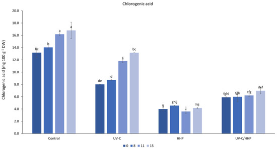 According to the statistical results, the storage had a significant effect on the chlorogenic acid content. The content increased during storage from 7.8 mg 100 g−1 DW to 10.3 mg 100 g−1 DW on the 15th day. The increase in chlorogenic acid content during storage is consistent with previously published studies [58,59]. The influence of the HHP and HHP/UV-C treatments (Figure 2), which resulted in the greatest reduction in chlorogenic acid, is also evidenced by the lowest increase in its content during 15-day storage (0.16 and 1.06 mg 100 g−1 DW, respectively). Such minimal increase in chlorogenic acid content in the aforementioned samples during storage could probably be related to the decreased activity of enzymes involved in chlorogenic acid biosynthetic pathways.