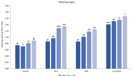 Interaction of treatment (control, UV-C, HHP, and UV-C/HHP) and storage time on reducing sugars. Error bars represent standard errors; lowercase letters represent a significant difference within means (p < 0.05).