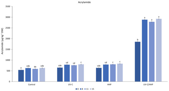 Interaction of treatment (control, UV-C, HHP, and UV-C/HHP) and storage time on acrylamide. Error bars represent standard errors; lowercase letters represent a significant difference within means (p < 0.05).