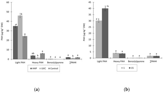 PAH content (µg kg−1 DW) in (a) control, UV-C-, and HHP-treated fried fresh-cut potatoes at (b) 1st and 15th day of storage. Results are expressed as least square (LS) means. Different letters within columns mean statistically different values at p ≤ 0.05.