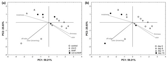 Sensory attributes of color (browning), odor, off-odor, firmness, and moistness were included in the PCA evaluation of the raw FCP (Figure 6). PC1 and PC2 described 84.24% of the total data variance. PC1 showed a strong correlation (>0.73) with all sensory attributes, while PC2 correlated strongly with color (browning) (r = −0.619) and off-odor (r = −0.604) and moderately with odor (r = −0.524) and firmness (r = −0.407). With regard to treatment, all UV-C-treated samples were placed on the positive PC1 due to their higher firmness and odor scores and lower off-odor scores. Almost all HHP- and UV-C/HHP-treated samples were located in the positive PC2 range with the highest scored moistness. In terms of storage, clustering was observed at day 0 and day 8, with almost all samples distributed at positive PC1, as they were characterized by higher scores of firmness and odor. Samples evaluated on the 11th and 15th day were situated mostly on negative PC1 due to higher moistness and color (browning) scores.