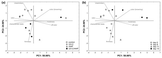 The boiled FCP sensory attributes of color (browning), odor, off-odor, moistness, firmness, creaminess, and characteristic taste were put in relations with the treatment applied and storage time (Figure 7). PC1 and PC2 explained 83.86% of the total data variance, with PC1 showing a very strong correlation with odor (r = −0.978) and characteristic taste (r = −0.958), a strong correlation with color (browning) (r = 0.808), off-odor (r = 0.885), and moistness (r = 0.669), and a moderate correlation with creaminess (r = −0.539). It was noticeable that the samples treated with UV-C were grouped in the upper left quadrant, which is characterized by more pronounced creaminess and odor. Control samples were grouped on positive PC2, defined by increased creaminess and color (as browning). Pronounced firmness was the most evident in the HHP- and UV-C/HHP-treated samples. Separation of samples stored for 0 and 8 days was noticeable at negative PC1 and correlated with higher odor, firmness, creaminess, and characteristic taste scores. Most samples on day 15 were associated with increased color (browning) values.