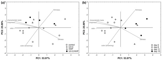 PCA results for fried FCP are shown in Figure 8. PC1 and PC2 described 79.86% of the total data variance. The sensory attributes of color, odor, oiliness, firmness, crispiness, and taste were evaluated. A strong correlation was found between odor (r = −0.890), oiliness (r = 0.714), crispiness (r = 0.850), and taste (r = −0.863) and PC1, as well as between color (r = −0.773), and firmness (r = 0.763), and PC2. Color and firmness correlated moderately with PC1 and oiliness with PC2. Clear separation from other samples by PC2 was visible for the control and UV-C samples. UV-C samples were grouped on the negative PC2 based on higher color and odor scores, while the control samples showed high correlation with color and oiliness. The HHP- and UV-C/HHP-treated samples were situated on the positive side of PC2, mainly due to the lower color and oiliness scores and higher firmness scores. Regarding storage, all samples scored at day 0 and day 8 were distributed on the negative PC1 side due to the more pronounced positive attributes of color, odor, crispness, and taste. In contrast, all samples on the 15th day were placed on the positive PC1 due to the lower scored attributes previously mentioned but also due to the more pronounced oiliness.
