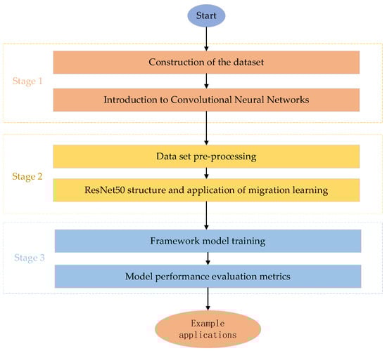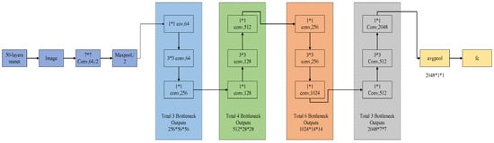 Theoretically, the ability to express is more vital with deeper networks. However, network degradation, gradient disappearance, and explosion problems occurs more often with an increasing number of learning layers. This problem can be solved by the standard initialization and regularization layers, which ensures that dozens of layers of the network can converge. However, it also suffers from the issue of network degradation, gradient disappearance, and explosion. Therefore, this paper used ResNet (residual network), which introduces jump connections, enabling an unimpeded flow of information from the previous residual block. Thus, the proposed method can avoid network degradation, gradient disappearance, and the degradation problems caused by being too deep within the network. The network structure of ResNet50 is shown in Figure 4.