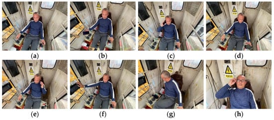When the behavioral classification is based on the accident causation theory, and other classification bases, it tends to result in fewer classification categories, which eventually leads to a high rate of detection errors. In this paper, we performed the behavioral classification according to human behavior. The collected 102,150 images of the various driver behaviors were classified and divided into eight categories according to the recognition target, namely, everyday driving, i.e., looking at the phone (right hand), looking at the phone (left hand), calling (right hand), calling (left hand), adjusting meters, holding things in the back seat, and holding glasses. An example image of tower crane driver behavior is shown in Figure 3.