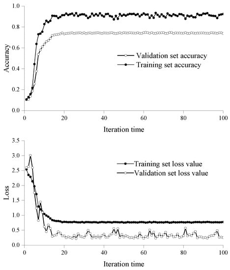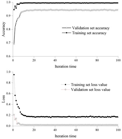 As seen from Figure 6, there was a slow improvement in accuracy of the training set during training for the ResNet50 network model without migration learning, where the loss value during the iterations hovered around 1.0. At the same time, the accuracy and loss values also changed slowly on the validation set. It can be seen from Figure 7 that, the network can fit the sample accurately using transfer learning, which rapidly improves accuracy and reduces the loss value and the proposed method can converge quickly. It can be seen from the comparison that migration learning can significantly improve the network.