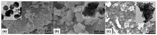 The morphology and structure are explored by SEM and TEM for MRGO, MRGO@ZIF-7, and MRGO@ZIF7-MIP, as shown in Figure 1. Figure 1a shows the SEM and TEM (inset) images of sample MRGO. Fe3O4 microspheres are uniformly distributed on the RGO surface with an average particle size of about 200 nm. Figure 1b shows the SEM and TEM (inset) images of sample MRGO@ZIF-7, where Fe3O4 and ZIF-7 have adhered well to the surface of wrinkled RGO. ZIF-7 demonstrates a three-dimensional block structure, smooth surface, and an average particle size of around 400 nm. Figure 1c shows SEM and TEM (inset) images of sample MRGO@ZIF7-MIP; the description shows that ZIF-7 and MRGO are covered by molecularly imprinted polymers when MIP is grafted onto the MRGO@ZIF-7 surface.