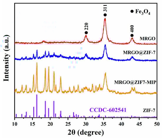 The structural properties of the prepared experimental materials were characterized using the XRD technique (Figure 2). For MRGO, the peaks represent the Bragg reflections of (220), (311) and (400) facets, which match well with those of Fe3O4 nanoparticles (JCPDS Card No. 19-0629), indicating the coating of Fe3O4 microspheres on RGO [61]. After the decoration of ZIF-7, typical diffraction peaks of ZIF-7 emerge, consistent with the reference XRD pattern for the cubic ZIF-7 (CCDC Card No. 04-2541) [54]. Furthermore, the crystal plane diffraction peaks of Fe3O4 microspheres can also be observed. These observations suggest that the introduction of ZIF-7 did not affect the crystalline structure of MRGO. When MIP was grafted onto the surface of MRGO@ZIF-7, the positions and widths of the diffraction peaks did not change, indicating that the crystalline structures of the Fe3O4 microspheres and ZIF-7 were not affected by the grafted MIP.