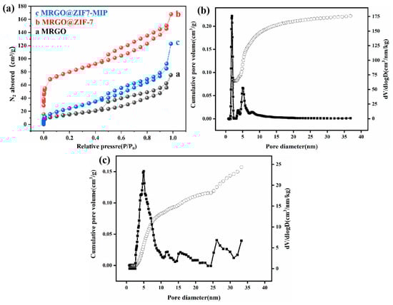 (a) The nitrogen adsorption–desorption isotherms of MRGO@ZIF7-MIP, MRGO@ZIF-7 and MRGO and (b,c) pore size distribution of MRGO@ZIF-7 and MRGO@ZIF7-MIP.