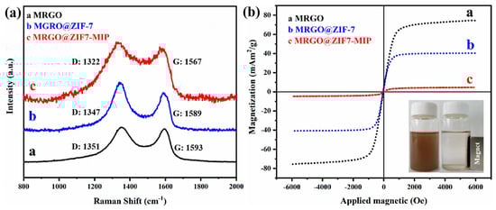 Raman spectroscopy is an effective method for characterizing the structure and properties of graphene materials, such as surface defects, edge structures, and doping states. Figure 4a shows the Raman spectra of MRGO, MRGO@ZIF-7, and RGO@ZIF7-MIP. Two distinct absorption peaks appear in the spectra of all three materials for the G and D peaks, respectively. The G peak is the main characteristic peak of graphene materials, which is caused by the in-plane vibration of sp2 carbon atoms and appears near 1580 cm−1 [64]. The D peak is usually considered the disordered vibrational peak of graphene materials, which is caused by the lattice vibrations leaving the center of the Brillouin zone. It is used to characterize the structural defects on the surface of graphene materials and appears near 1370 cm−1 [65]. Compared with MRGO and MRGO@ZIF-7, the D-band of RGO@ZIF7-MIP was the widest, indicating that the disorder of graphene layers gradually increased during the functionalization modification. By comparing the G-bands of the three materials, it can be seen that the G-peaks of both RGO@ZIF7-MIP and MRGO@ZIF-7 are blue-shifted compared to those of MRGO, indicating that there is an interaction between ZIF-7, MIP, and magnetic graphene, which provides evidence for the successful preparation of the various materials. In addition, the intensity ratio (ID/IG) is characteristic of the extent of disorder present within the material [66]. The calculated ID/IG ratios for the three materials are 1.04, 1.07 and 1.1, respectively, which again indicate the increase in surface disorder of graphene materials. Figure 4b shows the magnetic hysteresis loop of MRGO, MRGO@ZIF-7, and RGO@ZIF7-MIP. All three materials have good magnetic properties, and the saturation magnetization intensity of MRGO is the largest (74.97 emu g−1). The magnetic intensity of the composites gradually decreases after the gradual modification of ZIF-7 and MIP on their surfaces. The saturation magnetization intensity of RGO@ZIF7-MIP is minimal (4.84 emu g−1) and still has the magnetic properties required for magnetic separation. Effective magnetic separation can be observed after about 80 s under the action of an external magnetic field, as shown in Figure 4b (bottom inset).