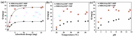 Adsorbent dosage is an important factor in deciding the adsorption time. In this work, the adsorbent dosage was evaluated in the range of 1–20 mg, and the results are shown in Figure 5a. It can be seen that the adsorption capacity was increased as the adsorbent dosage gradually increased. When the amount of adsorbent is 10 mg, the saturation point of adsorption is almost reached, and the adsorption amount of MRGO@ZIF7-NIP is less than MRGO@ZIF7-MIP. In the experiment, the MRGO@ZIF7-NIP and MRGO@ZIF7-MIP were set as a control group to optimize the temperature of the adsorbent for the adsorption process. As shown in Figure 5b, when the temperature increased to 25 °C, the adsorption capacity of MRGO@ZIF7-MIP composites is the largest. Although the adsorption capacity of MRGO@ZIF7-NIP increased as the temperature gradually increased, the increment was not obvious, and it may be due to the fact that the higher the temperature in the adsorption experiment, the higher the kinetic energy of the molecules and the more violent the irregular motion of the molecules [18]. Therefore, we carried out adsorption experiments at 25 °C. Figure 5c shows the effect of pH on the adsorption of PBA. The pH of the solution plays an important role in affecting the adsorption characteristics of BPA. When the solution pH value is about 7, that is close to neutral when the adsorption capacity of the adsorbent is the strongest. The adsorption capacity is less when the solution gradually becomes alkaline. It may be due to the weak acidity of BPA, which is easily neutralized when the solution becomes more basic. In a word, the adsorbent adsorption environment should try to control the neutral.