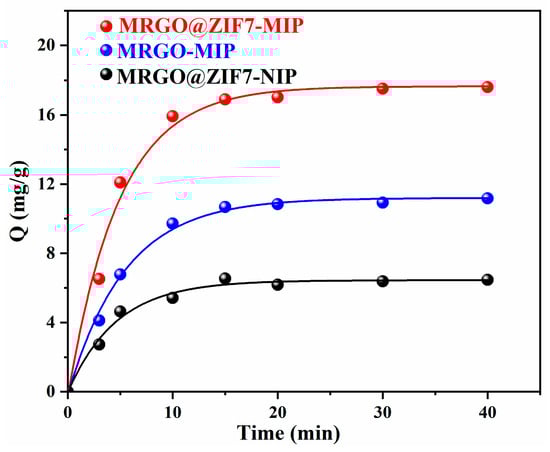 To investigate the binding properties of molecularly imprinted materials to template molecules, we performed an adsorption kinetic analysis of BPA using MRGO@ZIF7-MIP, MRGO-MIP, and MRGO@ZIF7-NIP, and the results are shown in Figure 6. It can be clearly seen that the adsorption process of the three materials on BPA was divided into two stages, the adsorption efficiency was faster from 0 to 15 min, the adsorption amount increased significantly with time, and the adsorption rate slowed down significantly after 15 min and gradually reached the adsorption equilibrium. In contrast, MRGO@ZIF7-MIP showed the best adsorption performance, and the specific recognition sites present on the surface of both MRGO@ZIF7-MIP and MRGO-MIP facilitated the adsorption recognition of BPA, and the adsorption capacity was superior to that of MRGO@ZIF7-NIP.