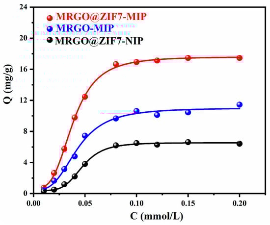 The adsorption capacity is an important parameter that reflects the performance of the adsorbent and determines the amount of adsorbent required during the adsorption experiment. The adsorption capacity of the adsorbent on the template molecules can be analyzed by the adsorption isotherm. The adsorption isotherms of BPA by MRGO@ZIF7-MIP, MRGO-MIP and MRGO@ZIF7-NIP are presented in Figure 7. The Langmuir isotherm model was adopted to fit the experimental data. The Qe are correlated with the isotherm model of Langmuir to Equation (2):