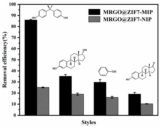 17β-E2, phenol and progesterone (P4), which are structurally similar to BPA, were selected as interferents to evaluate the selective recognition of BPA by MRGO@ZIF7-MIP. As shown in Figure 8, the removal efficiency of BPA, 17β-E2, phenol, and progesterone (P4) can reach 85.92%, 35.14%, 29.82%, and 19.10%, respectively, after being treated with MRGO@ZIF7-MIP. The molecularly imprinted polymer structure has “imprinting pores” that match the size and shape of the template molecule. The active site in the “imprinted pore” is able to bind specifically to the target molecule, resulting in MRGO@ZIF7-MIP exhibiting excellent selectivity for BPA. However, the MRGO@ZIF7-NIP has no selectivity; its effect on the removal efficiency of BPA, 17β-E2, phenol and progesterone (P4) is similar (25.14%, 19.04%, 16.14%, 10.32%, respectively). The results of the selectivity study indicate that molecularly imprinted nanofilms do have highly sensitive recognition of template molecules.