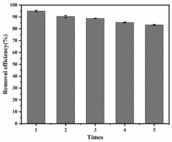 In addition, we performed 5 cycles of adsorption experiments on BPA using MRGO@ZIF7-MIP to evaluate its stability and reusability. The adsorption results of repeated uses in MRGO@ZIF7-MIP are shown in Figure 9. The MRGO@ZIF7-MIP can be reused after extraction with an acetic acid/methanol (1/9, v/v) mixture, and no obvious decrease in the adsorption capacity was observed. The adsorption capacity of MRGO@ZIF7-MIP for BPA slightly decreased during 5 cycles of adsorption, which might be related to the loss of memory cavity during regeneration. The study showed that MRGO@ZIF7-MIP has good stability and can be reused.