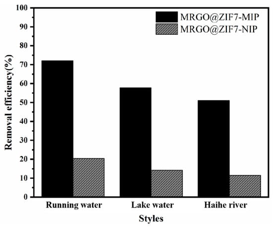 Tap water, lake water and sea river containing 0.08 mmol L−1 BPA were selected as “simulated” wastewater to investigate the adsorption selection performance of MRGO@ZIF7-MIP in the real water environment. As seen in Figure 10, the MRGO@ZIF7-MIP can produce good recovery, and the removal efficiencies of BPA are 72.07%, 57.84% and 51.26%, respectively. The results show that the imprinted polymer present on the surface of MRGO@ZIF7-MIP has good specific molecular recognition ability for BPA and can be effectively applied to remove phenolic endocrine disruptors from the actual aqueous environment.
