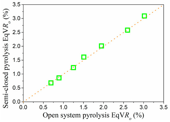 Comparison of shale thermal maturity based on open and semi-closed system pyrolysis experiment. Data of semi-closed pyrolysis are cited from Fang et al. [21].