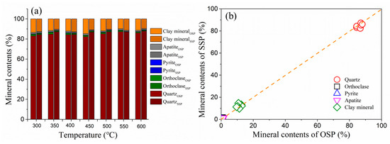 (a) Columnar diagram of mineral contents between two pyrolysis experiments, and (b) Mineral contents comparison between two pyrolysis experiments. Notes: OSP-Open system pyrolysis; SSP- Semi-closed system pyrolysis. Data of semi-closed pyrolysis are cited by Fang et al. [21].