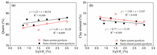According to XRD analysis, the shale samples are mainly composed of quartz, clay mineral orthoclase, apatite, and pyrite. For both experiments, quartz is the most abundant mineral, followed by clay, and pyrite is the least abundant (Figure 4a). Overall comparison of mineral content between open and semi-closed system pyrolysis experiments are shown in Figure 4b. The mineral contents at each temperature point are distributed near the straight line of 1:1. To make the comparison of mineral content by the two pyrolysis experiments more obvious, a separate comparison was provided for each mineral (Figure 5). For both open and semi-closed system pyrolysis experiments, the quartz content increases with the thermal maturity, while the content of clay minerals decreases with the thermal evolution. Previous studies showed that organic matter produces a large amount of organic acid during thermal evolution. Clay and feldspar can be dissolved by organic acids [43], and the catalytic activity of clay minerals can be strengthened by treatment with weak organic or inorganic acids [27,44]. During thermal evolution, organic acid accelerates the transformation from smectite to illite [27]. After being dissolved by organic acids, feldspar releases K ions and forms quartz; this results in the quartz-filling phenomenon [27,45], which explains the increase in quartz content with the shale thermal evolution. For each of the experimental temperature points, the existence of formation pressure increases the percentage of quartz and decreases the content of clay minerals (Figure 5a,b). This indicates that the formation pressure inhibits the formation of quartz. At the same time, high pressure is conducive to the conversion of montmorillonite and kaolinite to illite. This is because the higher formation pressure promotes the formation of quartz. At the same time, high liquid pressure is conducive to the transformation of montmorillonite and kaolinite to illite [46].