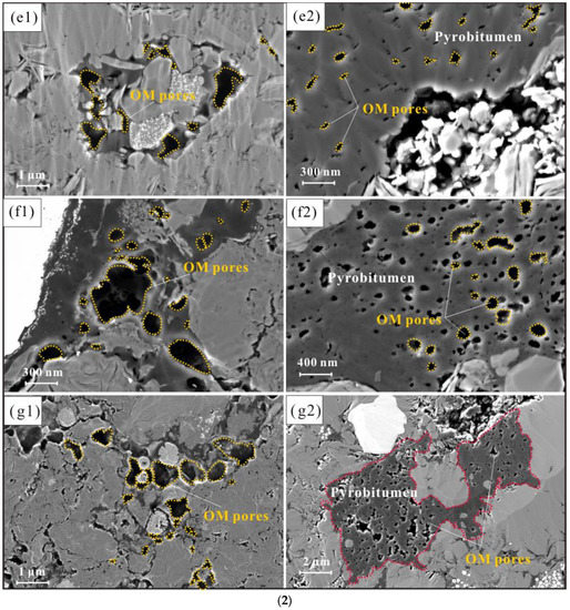 (1) SEM images of pyrolysis samples at temperatures from 300 to 450 °C. (2) SEM images of pyrolysis samples at temperatures from 500 to 600 °C. Notes: (a1–g1) samples based on open system pyrolysis: (a1) micro-fracture in inorganic mineral at 300 °C, Ro = 0.68%; (b1) mineral shrinkage pore and interpores at 350 °C, Ro = 0.86%; (c1) secondary mineral at 400 °C, Ro = 1.23%; (d1) OM pore at 450 °C, Ro = 1.61%; (e1) OM pore at 500 °C, Ro = 2.01%; (f1) OM pore at 550 °C, Ro = 2.58%; (g1) OM pore at 600 °C, Ro = 3.09%. (a2–g2) Samples based on semi-closed system pyrolysis: (a2) dissolved pores and pyrite at 300 °C, Ro = 0.69%; (b2) original OM pores developed at 350 °C, Ro = 0.89%; (c2) liquid hydrocarbon and microfracture at 400 °C, Ro = 1.25%; (d2) there are a large number of OM pores in the pyrobitumen of shale at 450 °C, Ro = 1.51%; (e2) OM pores at 500 °C, Ro = 1.95%; (f2) OM pores with good connectivity in shale at 550 °C, Ro = 2.60%; and (g2) large size OM pore with good connectivity in shale at 600 °C, Ro = 3.02%. (a2–g2) are cited from Fang et al. [21].