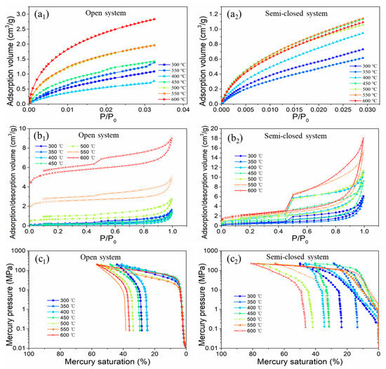 (a1,a2) CO2 adsorption isotherms, (b1,b2) N2 adsorption/desorption isotherms, and (c1,c2) MIP curves from the two pyrolysis experiments. Data of semi-closed pyrolysis are cited from Fang et al. [21].