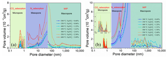 Full-scale pore size distribution of pyrolysis shales obtained by MIP, N2 and CO2 physisorption based on (a) open system and (b) semi-closed system pyrolysis experiments [21].