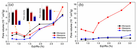 - When EqVRo > 1.51%, the formation pressure reduces the heterogeneity of pore volume. In this stage, the partial micropore volume begins to transform into mesopore volume [35], and the existence of formation pressure makes some thinner pore walls rupture, which increases pore connectivity [35,53] and decreases the heterogeneity of pore structure.
