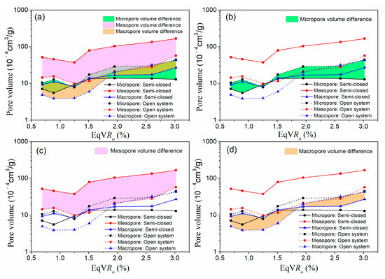 The difference in pore volume in the shale samples between the open and semi-closed system pyrolysis experiments. (a) Total comparison of pore volume; (b) micropore volume difference; (c) mesopore volume difference; (d) macropore volume difference. Data of semi-closed pyrolysis are cited from Fang et al. [21].