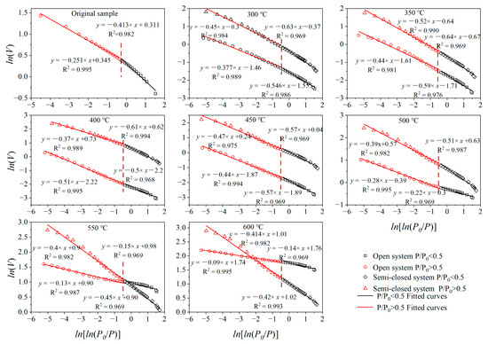 Plots of ln(V) versus ln[ln(P0/P)] from low-temperature nitrogen physisorption isotherm data using the open system and semi-closed system pyrolysis experiments. Data of semi-closed pyrolysis are cited from Fang et al. [21].