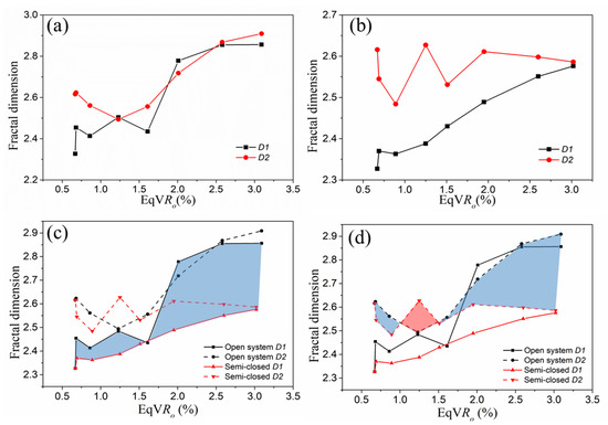 Relationships between fractal dimension and Ro based on (a) the open system and (b) semi-closed system pyrolysis experiments; (c) pore surface fractal dimension variation between the open and semi-closed system pyrolysis experiments during shale thermal evolution; (d) pore structure fractal dimension variation between the open and semi-closed system pyrolysis experiments during shale thermal evolution. Note: D1 is the pore surface fractal dimension, and D2 is the pore structure fractal dimension. Data of semi-closed pyrolysis are cited from Fang et al. [21].