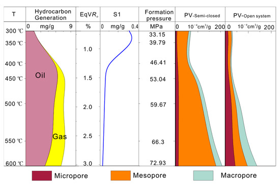 The pore volume initially decreased, but then increased during open-system pyrolysis (Figure 10a). The pore volume transition is basically consistent with the four stages of thermal maturation. At the maturity stage (300 °C–400 °C, 0.68% < EqVRo < 1.23%), the volume of the mesopores are the largest, followed by micropores and macropores. At the highly matured stage (400 °C–550 °C, 1.23% < EqVRo < 2.58%), before 550 °C, the micropores volume becomes the largest, mesopores follows and the macropores volume are the least. After 500 °C, the volume of the micropores are still the largest, however, they are now followed by the volume of macropores, and the mesopores volume are the smallest. At the overmatured stage (500 °C–600 °C, 2.58% < EqVRo < 3.09%), the mesopores volume are the largest, and the volume of the macropores are equivalent to that of the micropores. For the semi-closed system, the volume of mesopores decreases first and then increases significantly during the thermal evolution of shale, while the volume of micropores and macropores change insignificantly (Figure 10b). Mesopores account for most of the volume (nearly 70% of the total pore volume), which indicates the volume of mesopores is more significantly affected by formation pressure than micropore and macropore.