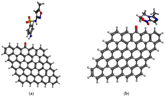 For a multicomponent system, the adsorption of both antibiotics was evaluated over the carbonaceous surface containing the semiquinone group and considering π-π interactions among the surface and the antibiotic molecules (SMX and MNZ). The Eads were favorable for the adsorption of both molecules with a value of −10.36 kcal mol−1, indicating that the SMX adsorption occurs first, followed by the MNZ, in a multicomponent system.