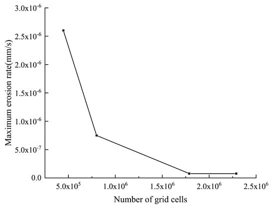 The accuracy of the calculation results and computer resources should be comprehensively considered while calculating the number of grids in the domain, and the maximum wear rate should be taken as the target to verify the grid independence. The grid models with various numbers are shown in Table 3. When the number of grids increased to approximately 1.8 million, the maximum erosion rate tended to be stable (Figure 2). Considering the required accuracy and computer resources, it was decided to choose the grid model of option 3.