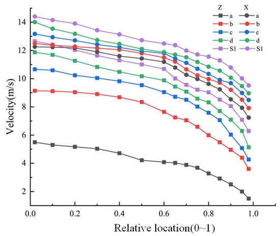 By comparing the velocity distribution in the X and Z directions of the deflector runner, it can be seen that the velocity deficit phenomenon at the end of the needle guide mainly occurs in the Z direction of the injector (Figure 6), and the velocity deficit rate in the Z direction is larger in the runner at the end of the needle guide. A cross-section was closer to the end of the needle guide, and the velocity deficit phenomenon was more serious compared with the X direction where no velocity deficit occurred. The average value of the velocity deficit was 6.6 m/s. The average velocity deficit in the Z direction was 3.7, 2.8, 2.4, and 2.2 m/s at sections b, c, d, and S1, respectively. As the water moves along the injector, the effect of the vortex trails from the end of the deflector and the velocity of the water diminishes. At the relative position 0.8, the velocity of the water in the flow channel abruptly changes and the rate of reduction in the water velocity increases. This is due to the viscous nature of the water and blocking effect of the boundary layer on the inner wall of the nozzle tube, thus leading to a sudden reduction in the water velocity.