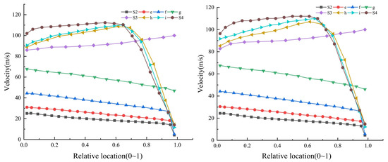 As the injector converts the water flow into a form of energy, the same velocity deficit phenomenon occurs at the tip of the needle tip. The water velocity increases uniformly in the flow path from sections S2 to g (Figure 7). This is the process of converting pressure (potential energy) into velocity (kinetic energy), and the water velocity distribution tends to decrease uniformly along the increasing radius. When water flows from sections g to S3, the trend of change in the distribution of water flow reverses, while the water velocity along the direction of increasing radius continues to increase, which is the needle tip velocity deficit phenomenon. From sections S3 to S4 of the flow channel, the relative position of 0 represents the center of the cylindrical jet; the relative position of 1 represents the water–gas intersection of the cylindrical jet. The relative position is between 0–0.66. It can be observed that the velocity within the cylindrical jet along the radius direction exhibits a gradual increasing trend. At the relative position of 0.66, the velocity is the highest, and the velocity distribution trend takes a sharp turn, exhibiting a downward trend. Sections h, i, and S4 represent the velocity distribution trend inside the cylindrical jet, which indicated that the velocity inside the cylindrical jet first increases steadily, then decreases suddenly and sharply, and does not exhibit a uniform distribution trend. The average velocity of the internal velocity of the cylindrical jet is 111.8 m/s, which meets the power generation requirement of the large Pelton turbine.