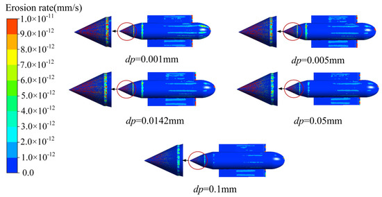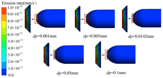 Nozzle erosion clouds for different sediment particle diameters are shown in Figure 9. The erosion of the nozzle port ring significantly decreases as the diameter of the sediment particles increases. However, the location of the erosion is very similar. Therefore, the diameter of the sediment particles will have an impact on the erosion rate; however, their impact on the surface erosion range is very small.