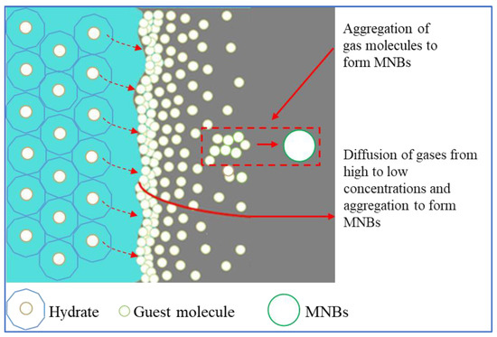 In recent years, MNBs generated during hydrate dissociation also have attracted wide attention in the scaling of molecular dynamics (MD) simulations. Bagherzadeh [46] simulated the evolution of methane molecules during the dissociation of methane hydrate through MD simulations. The hydrate dissociated layer by layer, with the solution gradually increasing in methane molecules and reaching supersaturation, resulting in the generation of MNBs. During the simulation, MNBs were formed in the dissociation solution by aggregation of methane molecules. The rest diffused into the gas phase to increase the gas phase pressure and remained in the aqueous phase to maintain aqueous phase saturation. Yagasaki [47] simulated the effect of MNBs on the dissociation of methane hydrate. It was found that as the methane hydrate dissociates, the methane molecules gradually diffuse into the solution, and as the rate of diffusion of methane molecules in the solution is less than the rate of hydrate dissociation, this results in the solution being oversaturated with methane gas molecules. The generation of MNBs in the dissociation solution is shown in Figure 2. The hydrate as expected first dissociates at the outermost layer, and the rate of hydrate dissociation is greater than the diffusion rate of gas molecules in the aqueous phase. Therefore, the gas molecules accumulate at the hydrate–liquid interface, some gas molecules will enter the gas phase or remain in the aqueous phase through diffusion, and the gas molecules accumulate at the hydrate–water interface reaching supersaturation to form MNBs.