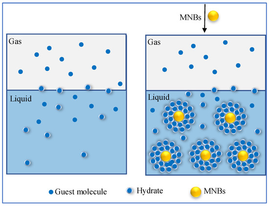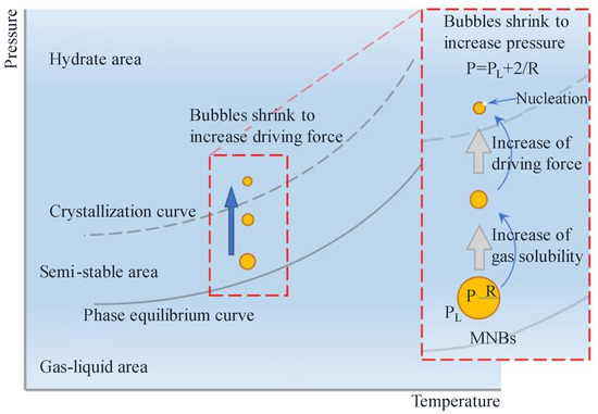 The self-contracting pressurized dissolution and collapse characteristics of MNBs increase the nucleation driving force to promote nucleation. It has been demonstrated that pressure fluctuation generated by collapsing MNBs promotes hydrate formation [74,75]. The smaller the bubble diameter, the higher the internal pressure and the higher is the driving force, which facilitates nucleation and further hydrate growth. Takahashi [76] used xenon MNBs to promote xenon hydrate formation, and it was found that the addition of MNBs accelerates hydrate nucleation even though the overall system temperature did not reach hydrate nucleation conditions. The hydrate formation process can be described as follows: first, the MNBs are present in the solution with self-contraction; subsequently, the internal pressure of the MNBs increases; finally, the self-contraction solution of the MNBs provides a greater drive for nucleation to approach or exceed the subcooling limitation, facilitating hydrate formation, as shown in the model diagram in Figure 4. Due to the high internal pressure and self-contraction effect of the MNBs, they have a great potential to promote hydrate formation and shorten induction time.