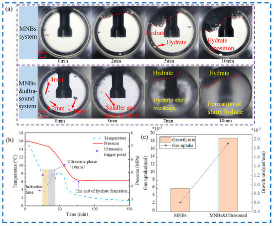 (a) Visualization of hydrate growth morphology by MNB system and ultrasound combined with MNB system, (b) ultrasound combined with MNB temperature curves, (c) ultrasound combined with MNBs on growth rate and gas uptake [49].