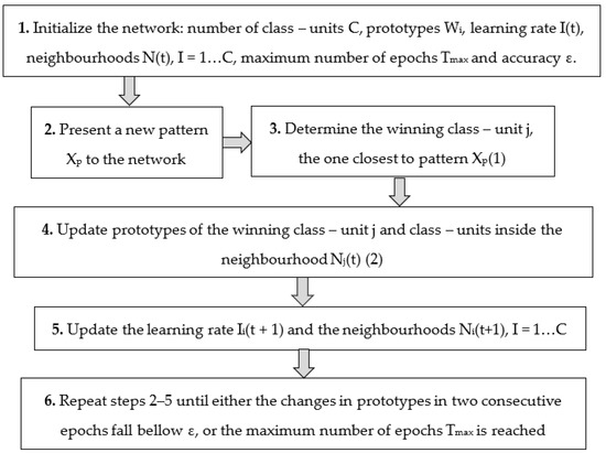 For SOM training, the standard Kohonen learning algorithm is usually used. It is an unsupervised, iterative training process, and produces a vector quantizer by updating the prototypes of the class units. At each training step, a sample vector is randomly chosen from the input data set, and the distances between and among all of the prototype vectors are computed. Then, the best-matching unit (BMU) is computed, and the prototype vectors are updated. Then, the BMU and its topological neighbors are moved closer to the input vector in the input space.