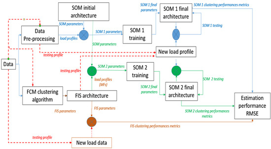 In our approach, we measured, with the help of smart metering instruments, the amount of energy from RES consumed by a series of programmable interruptible consumers in the house, i.e., a washing machine, dishwasher, and air conditioner, to obtain profiles of electric energy consumers, for each day of the week. The result of these computations was a database of daily profiles used for training two SOM architecture types (SOM1 and SOM2) and the FCM algorithm. These structures were then tested to classify new load profiles (see Figure 2).