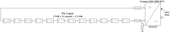 Table 1 lists the specifications of the 12 incorporated Luxor ECO LINE P60-275W PV panels (Luxor Solar, Stuttgart, Germany). The system that allowed for energy exchanges with the power national grid contained a Huawei SUN2000-3KTL inverter (Huawei, Shenzhen, China).