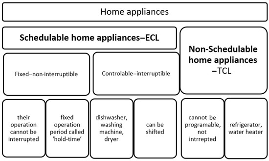 In the scientific literature [27], the concept of smart loads is associated with appliances in a smart home that can be controlled or not. Based on this clustering criteria, we identified in [28] a classification of these in non-schedulable (TCL) and schedulable home appliances (ECL) (see Figure 4).