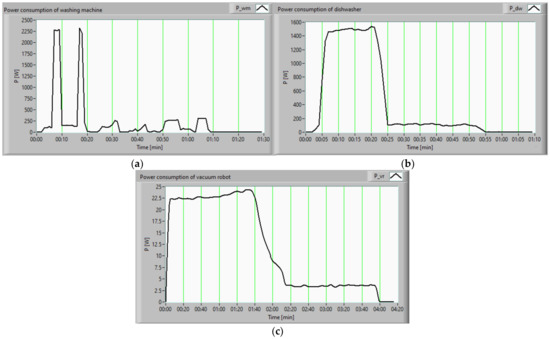 The consumption profiles of the washing machine, dishwasher, and vacuum cleaner, represented in Figure 5a–c, allowed us to program them with the help of shift algorithms, so that the energy produced from RES at different times of the day could be utilized to the maximum.