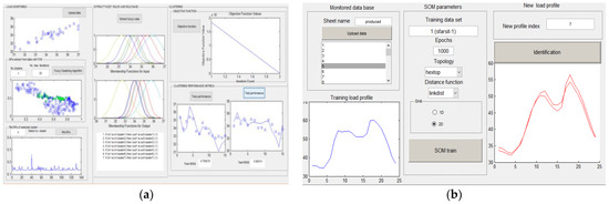 On the other hand, the initial stage in the Kohonen SOM example was architecture parametrization, which included the topology, training epochs, training data set, distance function, and grid representation. The load profiles of the customers were then classified in the testing and evaluation phases. The user had the possibility of selecting actual consumer profiles to upload from the monitored database for the SOM data training set. The user could also set the number of epochs that the training algorithm ran in the neuro-fuzzy system interface. The application provided the ability to assess and visually display the network’s performance progres-sion after training, including topology, neighbor connections, neighbor distances, sample hits, and SOM weight positions (see Figure 6b). The neuro-fuzzy knowledge-based system is shown in Figure 6.